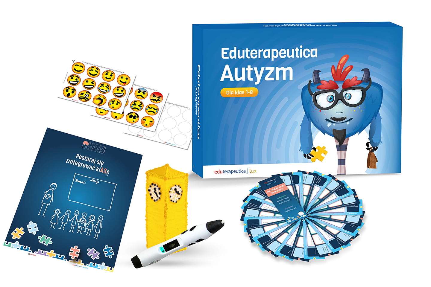 Eduterapeutica LUX Autyzm to zestaw praktycznych i różnorodnych materiałów, zebranych w jednym miejscu. Dostosowany dla całego grona pedagogicznego. W zestawie zawarto przydatne wskazówki, szczególnie dla nauczycieli klas 1-8. Wyjaśniamy, jak zachować się w pracy z uczniem ze spektrum autyzmu oraz jak przygotować całą klasę do integracji z uczniem z ASD.
