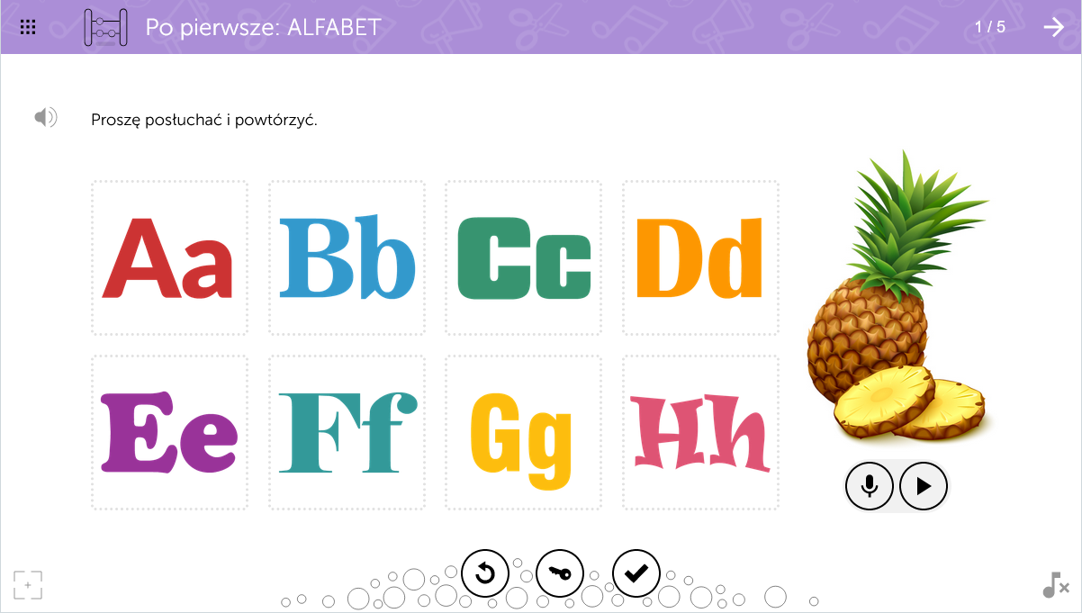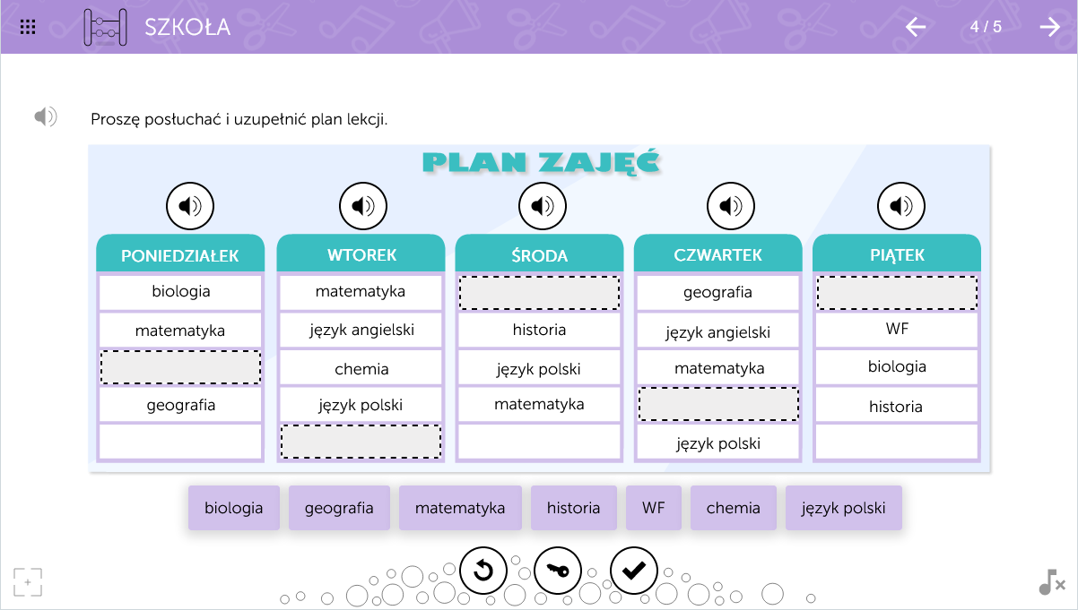 - teksty w wersji pisanej i do odsłuchania z symultanicznym podświetlaniem fragmentów, plansze tematyczne (np. rodzina, szkoła, ubrania), komentarze gramatyczne, zestawienia zwrotów komunikacyjnych oraz wiele różnorodnych ćwiczeń do poszczególnych części,
